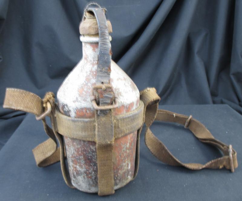 WWII Japanese equipment trio comprising water canteen with strap, military field cap, and officers leather document pouch (tears), condition variable.