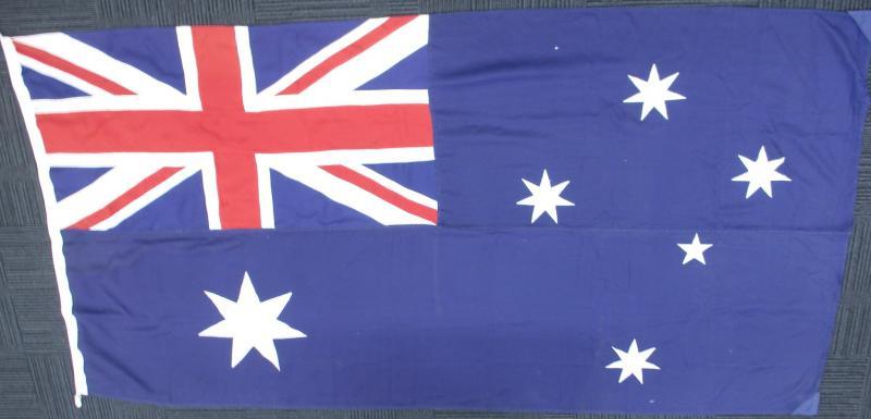 Miltary related items in two cartons with AIF uniforms, kit belts, lamp base with Rising Sun, bag of buttons and insignia, large British Navy flag, and Australian flag (post 2000), 'Tiny Boomerang' harmonica etc, condition mostly Poor/Fine.