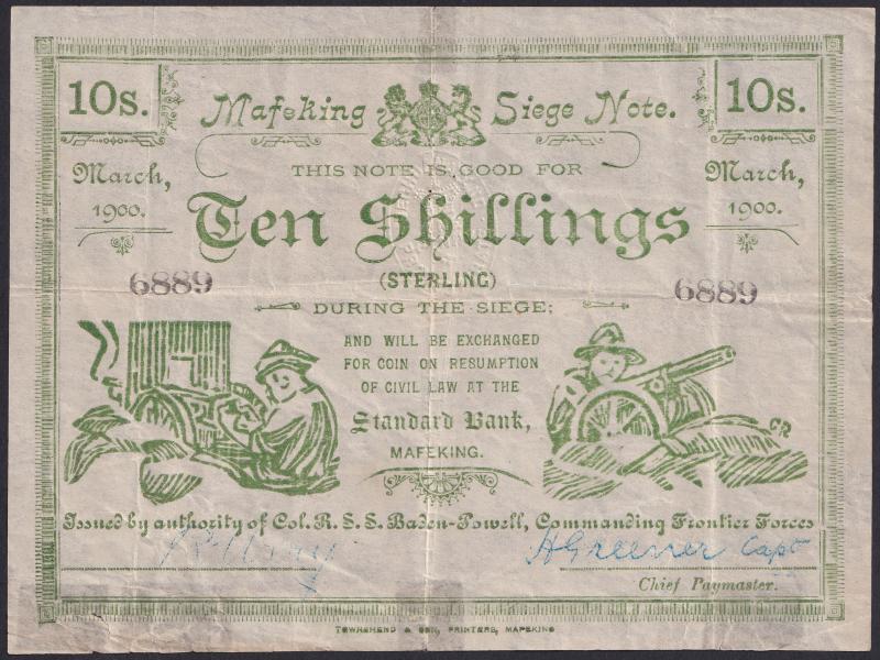 BANKNOTES - BOER WAR: SIEGE OF MAFEKING 1900 (March) 10/- green uniface banknote Pick S654b 'Commanding' spelled correctly, issued by Col R.S.S. Baden Powell, serial '6889', small paper holes, creases reinforced on back with stamp hinges, strong colour, aVF. (Image1)