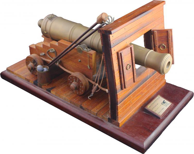 USS Constitution cannon 1:8 scale 24 Pdr Naval Gun, with deck, side of ship, cannon balls (11), bucket & ramrods, made by Palmer's Armoury (South Africa) who produce some of the finest handcrafted scale model cannons for sale in the world, limited edition 4/100, brass & wood, overall size 52x26x26cm. Superb model in excellent condition. Weighs 12kg. (Image1)