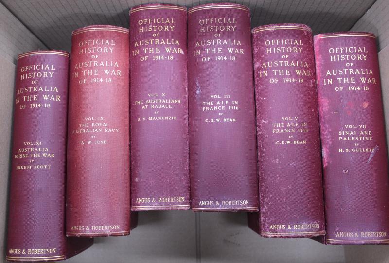 WWI 'Official History of Australia in the War of 1914-18', complete set of 12 volumes edited by CEW Bean, et al [Australian War Memorial, Canberra, 1923-42], Fair/Fine condition. Weighs 17kg.
