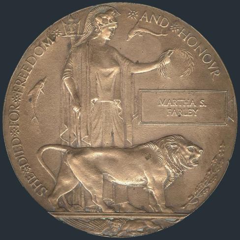 WWI NURSE'S MEMORIAL PLAQUE: Rare large size bronze WWI British Memorial Plaque issued to honour "Martha S. Farley" who died of illness contracted on duty as a Nurse at Adelaide Hospital in Dublin, Ireland in 1918. Ms. Farley was awarded the Royal Red Cross in 1917 for exceptional services in Military Nursing. Her extensive Military Nursing experience included time in Hospitals in England, South Africa & Ireland. "SHE DIED FOR FREEDOM" plaques are extremely rare and it is estimated that only 600 of these plaques were issued as compared to approx 1,355,000 of the more common "HE DIED FOR FREEDOM" plaques. Approximately 4.5" in diameter. (Image)