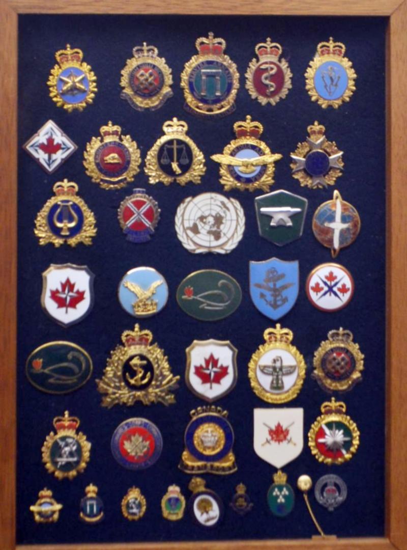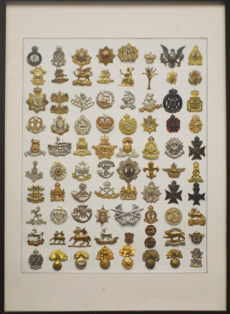 CAP BADGE COLLECTION: Large frame with an impressive collection of various cap badges from the 20th Century. Incl Canada Post Office; USAF ROTC; Welsh Guards Regiment; Royal Rifles of Canada; Irish Regiment of Canada; Brockville Rifles; Kings Royal Rifles Corps; The Royal Scots; and many more (80 items) (Image)