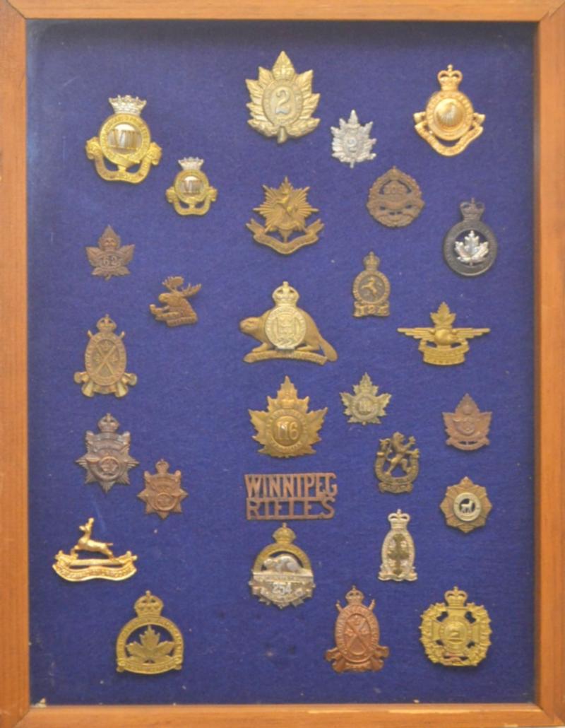 CANADA CAP & COLLAR BADGES: Large frame with a collection of various cap & collar badges mostly from WWI & WWII. Incl 8th Princess Louise's Hussars; 2nd Queens Own Rifles; Carleton & York Regiment; 109th Infantry Victoria & Haliburton; 62nd Battalion (British Columbia); 4th Canadian Mounted Rifles Regiment; 116th Battalion; Quinte's Own 254th Battalion; and many more (28 items) (Image)