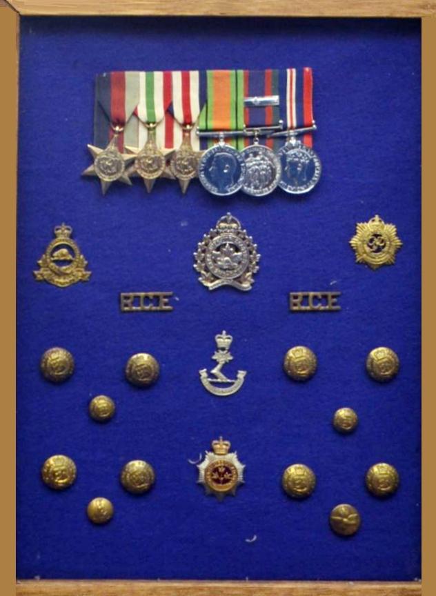 WWII MEDALS & INSIGNIA: Frame with an interesting group of WWII Medals & Uniform Insignia. Incl set of six WWII medals with 1939-45 Star, Italy Star, France & Germany Star, Defense Medal, Voluntary Service Medal, and War Medal, Canadian Army Corps cap badge, Lake Superior Scottish Regiment cap badge, Royal Army Service Corp cap badge, Royal Canadian Engineers (RCF) collar badges, Royal military College cap badge (French version), Canadian Guards Queen's Grenadier cap badge, and various buttons (25 items) (Image)