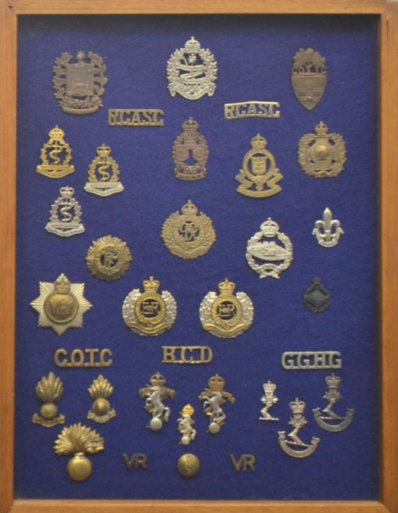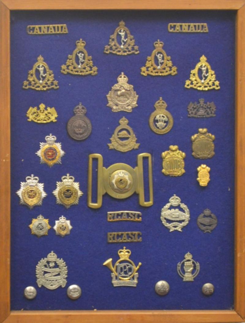 CANADA WWI & WWII UNIFORM INSIGNIA: Frame with an interesting collection of WWI & WWII Uniform Insignia. Incl 1st Calgary Highlands Brigade Shoulder badge; Lanark & Renfrew Regimental Cap badge; Hastings & Prince Edward Regiment collar badges; "CGA" Canadian Garrison Artillery shoulder badge; RCAF Cap badge, Canadian Armoured Tank Essex Regiment cap badge; Canadian 47th Frontenac Rifles Regiment collar badge; Officers rank pips; miniature Member of the Order of the British Empire; and more (19 items)