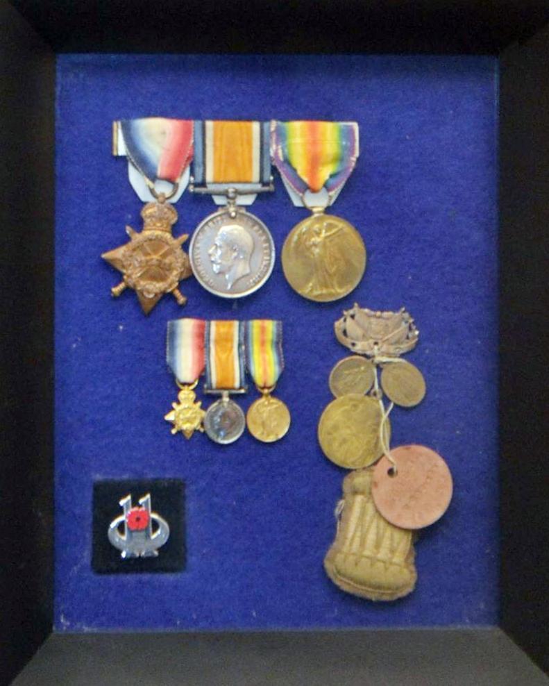 WWI MEDALS OF CORPORAL COULSON: Frame with the WWI Medals & badges of Corporal Percy Coulson who served in the Canadian Expeditionary Force. Incl set of three diff War Medals (1914-1915 Star, British War Medal & Victory Medal) along with matching miniature trio and his original identification tag, drum major cloth badge, and religious badges. A wonderful set! (Image)