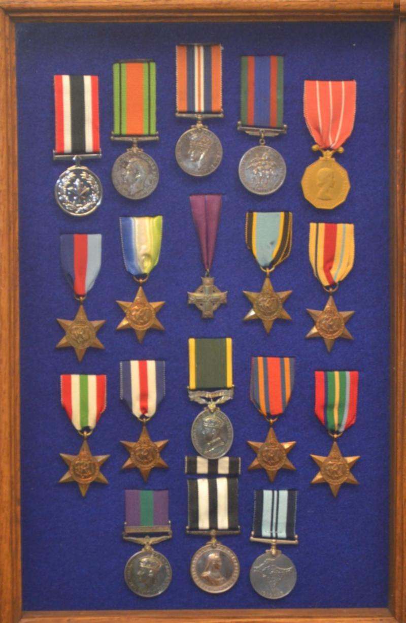 WWII WAR MEDALS: Large frame with an impressive collection of WWII War Medals and matching ribbons. Incl 1939-1945 Star; Atlantic Star; Royal Canadian Naval Volunteer Reserve Cross; Air Crew Europe Star; Africa Star; Italy Star; France & Germany Star; Territorial Efficiency Medal; Burma Star; Pacific Star; Service Medal with Palestine bar; Service Medal of the Order of St. John of Jerusalem; India Service Medal; and more (18 items) (Image)
