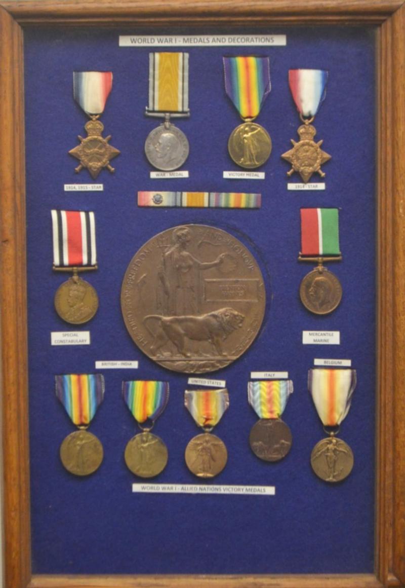 WWI MEDALS: Large frame with an impressive group of WWI medals. Incl 1914 Star; 1914-1915 Star; War Medal; Victory Medal; Special Constabulary Medal; Mercantile Marine Medal; large bronze Memorial Plaque to "Brenton Haynes"; and five diff Allied Nations Victory Medals from India, USA, Italy & Belgium (12 items) (Image)