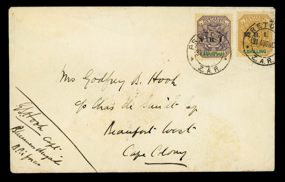 1900 BOER WAR GENERAL BADEN POWELL FORCE, a self censored letter from Captain E. S. Hook of the Blunness Brigade under Powell, posted from PRETORIA on AUG-31-1900 and addressed to his wife in BEAUFORT-WEST-C.G.H. with arrival SEP-5, a fabulous Transvaal 3sh6d occupation V.R.I. provisional stamp franking #209-210 overpays the rate, on the previous day (AUG-30) the Boers were defeated at NOOIGEDACHT-DAM (25 miles North of Pretoria) and 2000 prisoners were released, a connection should be researched, retails $150 US ($200 CDN), VF est ($75+ US) (Image)