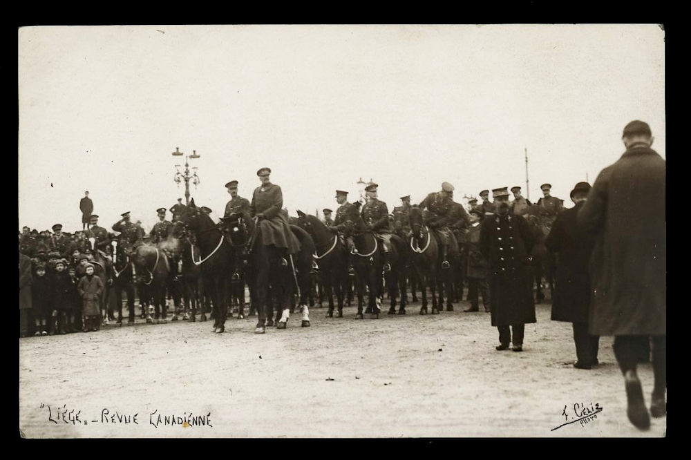 1918 CANADA SOLDIERS at LIEGE VICTORY PARADE, an F. Celiz published real photo card showing General Haige and Officers on horseback, scarce with retail over $50 US ($75 CDN), VF est ($35+ US) (Image)