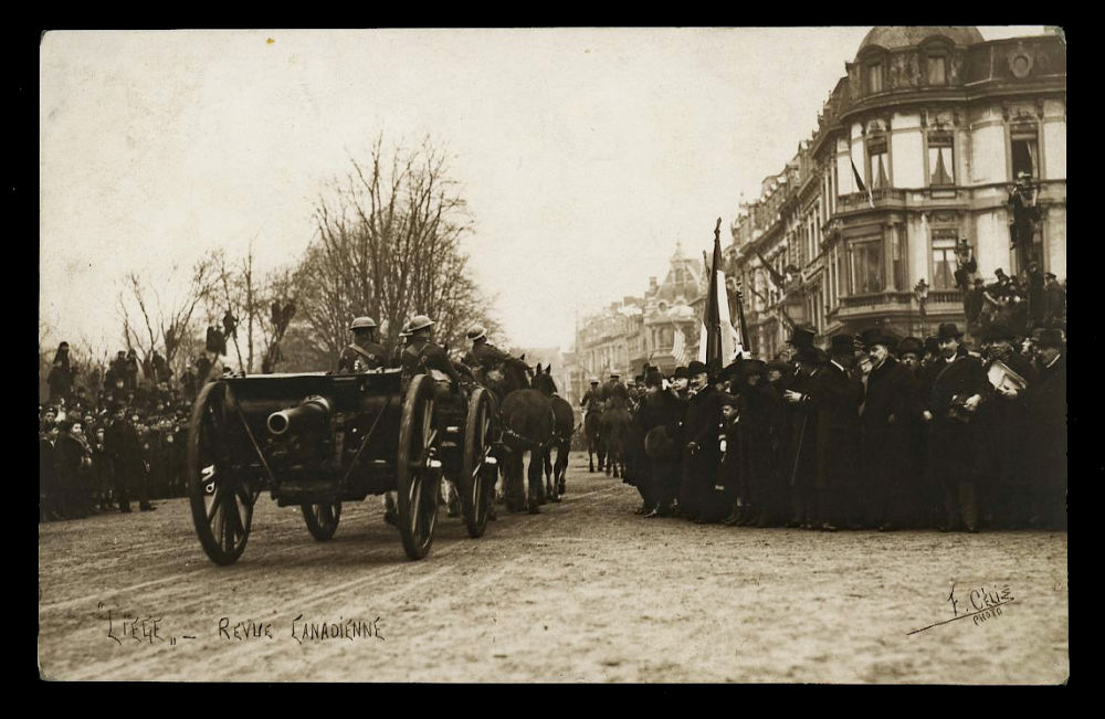 1918 CANADA SOLDIERS at LIEGE VICTORY PARADE, an F. Celiz published real photo card showing the Canadian Artillery corps, retail over $35 US ($50 CDN), VF est ($25+ US) (Image)