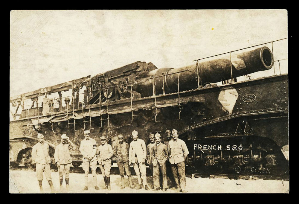 1915 FRENCH 520 mm RAILROAD CANNON, real photo showing the crew and massive gun, unposted with retail minimum $35 US ($50 CDN), VF est ($25+ US) (Image)