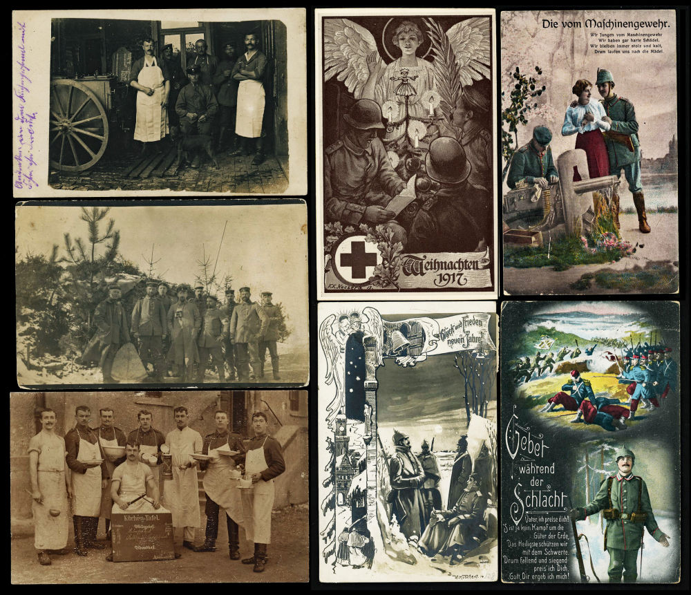 7 GERMAN SOLDIER POSTCARDS 1914-1918 , real photo cards showing kitchen cooking crews, field Medical Corps, 4 are soldiers greeting cards including a 1917 Red Cross card, retails $120 US ($175 CDN), F-VF est ($35+ US) (Image)