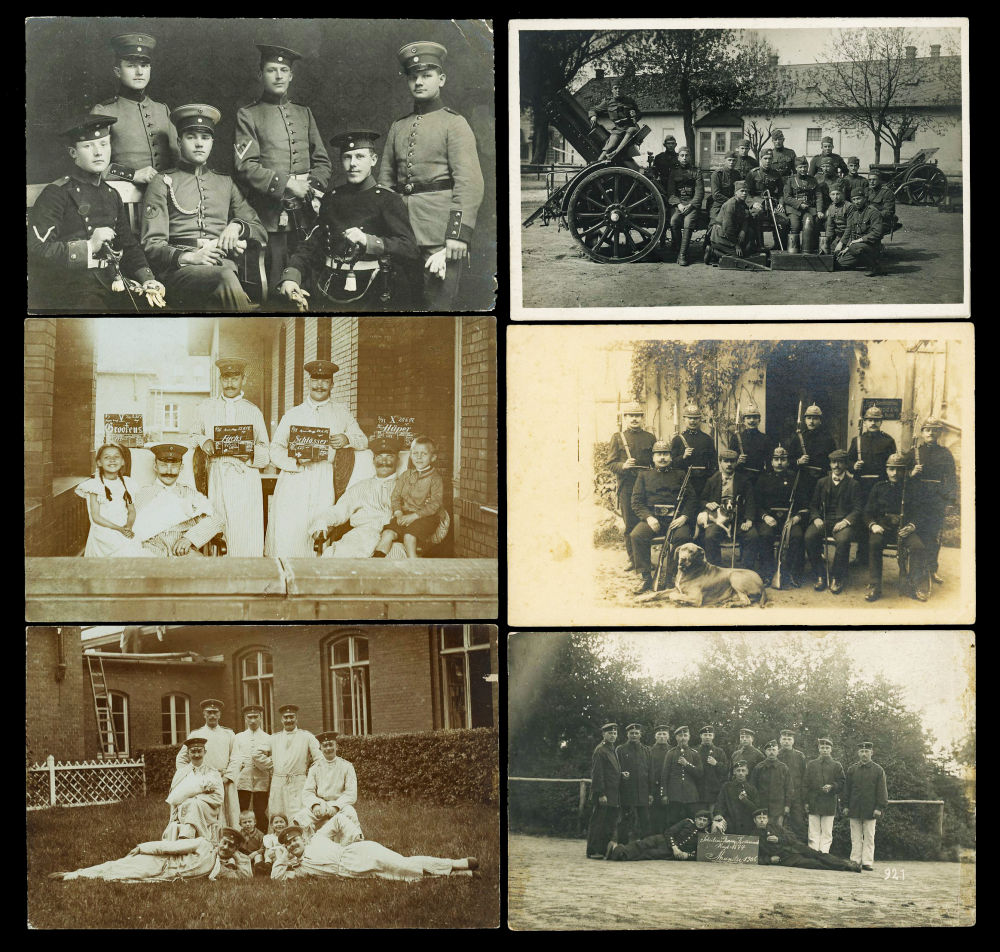 6 GERMAN SOLDIER POSTCARDS 1914-1918 (one earlier), real photo cards showing soldier groups, convalescing wounded soldiers, field gun crews, one is a 1906 pre-war Munster soldier unit group card, retails $150 US ($200 CDN), F-VF est ($35+ US) (Image)