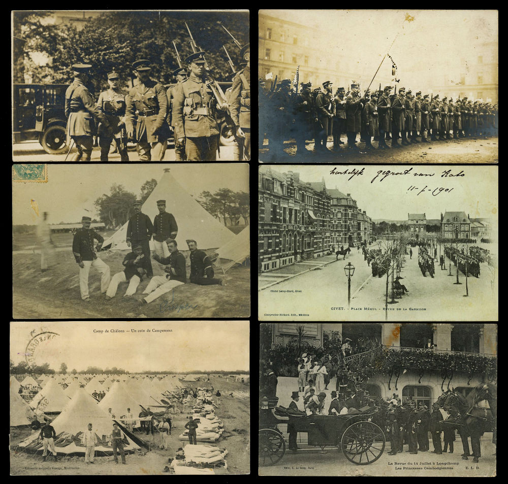 21 MILITARY WWI POSTCARDS 1901-1918, includes 10 real photo cards showing British and French soldiers + tanks + artillery, 10 cards are pre-war showing French soldier training garrisons and one with the tent camp at Chalon, 2 show War Victory celebrations ++, retails over $240 US ($350 CDN), F-VF est (Image)