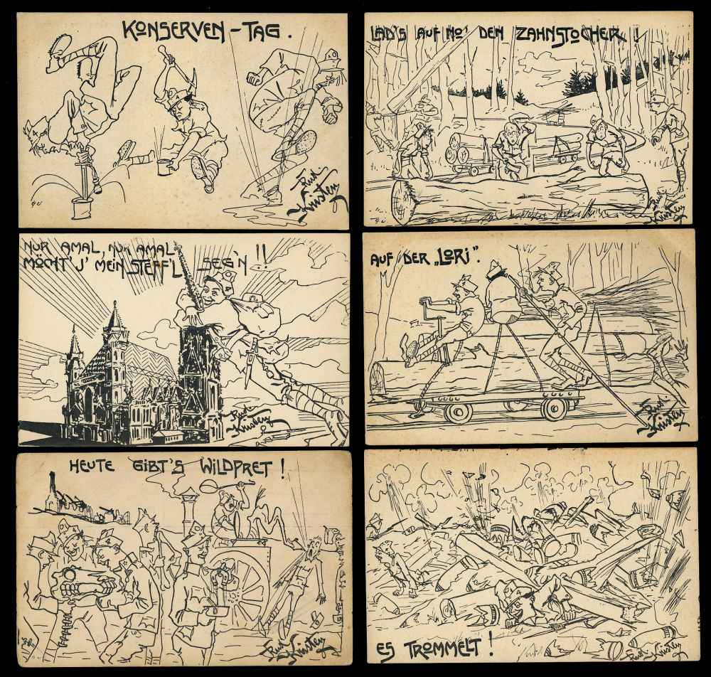 12 WWI "RUD KRISTEN" GERMAN POSTCARDS 1915, mint artist signed cards showing humorous soldiers life, retails over $150 US ($215 CDN), F-VF est (Image)