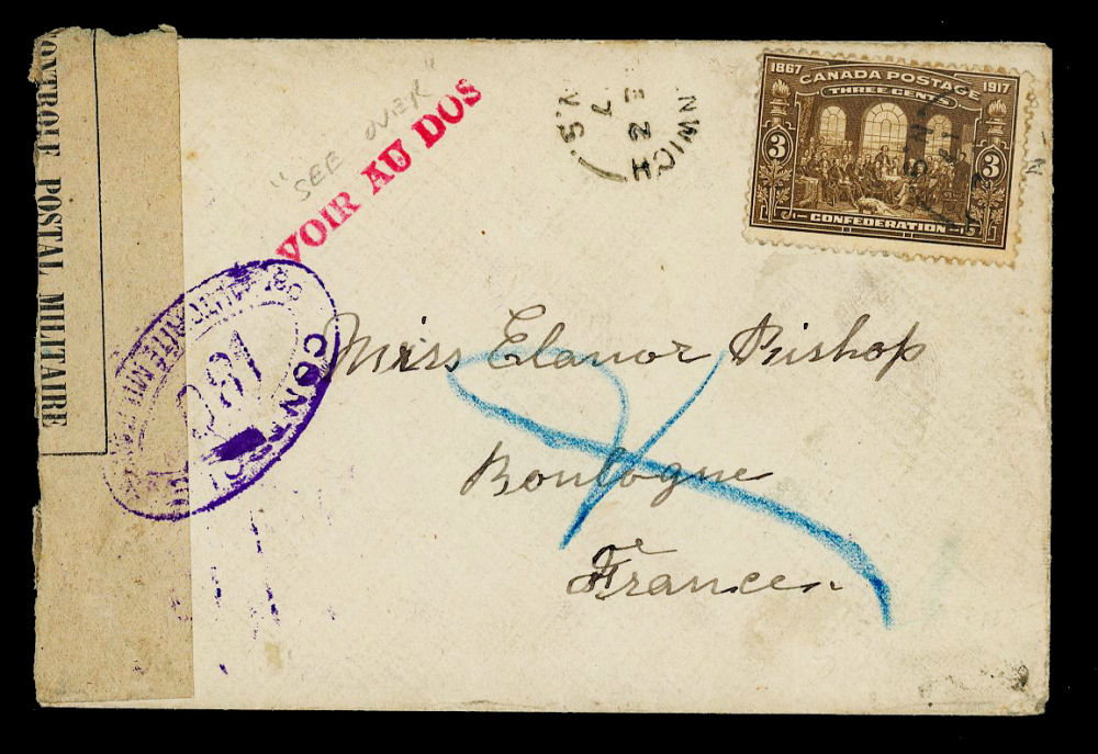 1917 CANADA 3¢ WAR RATE to FRANCE, scarce single franking #135 pays the 2¢ preferred country letter rate + 1¢ war tax on cover dated DEC-2-1917, addressed to Boulogne arriving JAN-14-1918, 43 days in transit with French censor sealing tape and No.180 censor h/s, addressee UNKNOWN and returned to sender, retails $75 US ($100 CDN), VF est ($50+ US) (Image)