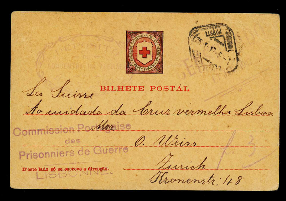 1917 AUSTRIAN POW in PORTUGAL, a Portuguese Red Cross card dated JAN-15-1917 with convenience address to the Swiss Red Cross in Zurich, Portuguese censor h/s on JAN-17, scarce card retailing $100 US ($150 CDN), VF est ($50+ US) (Image)