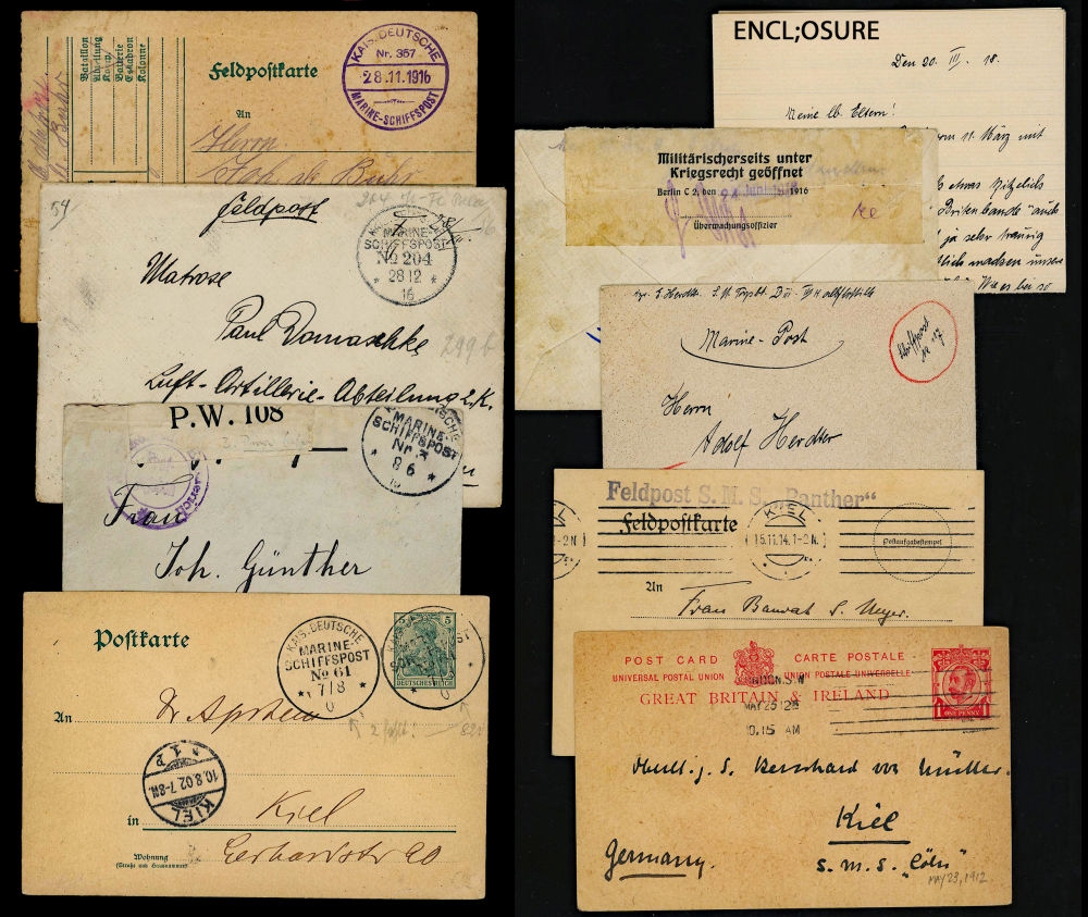 23 GERMAN WWI NAVY FELDPOST COVERS & CARDS 1902-1918, a nice range of dated Ship Feldpost locations noting No.23, 52, 81, 88, 107, 117 (torpedo boat), 145, 168, 181, 204 (U-Boat), 367, 468 ++, some with original letters enclosed, also note S.M.S. PANTHER Feldpost ship cancel, an endorsed cover from S.M.B. FRANK, lot includes 3 pre-war Navy items noting a 1902 card from Feldpost No.61, a 1914 cover from Feldpost No.66, and a 1915 card to the S.M.S. COLN in Keil, retails over $280 US ($400 CDN), F-VF est (Image)
