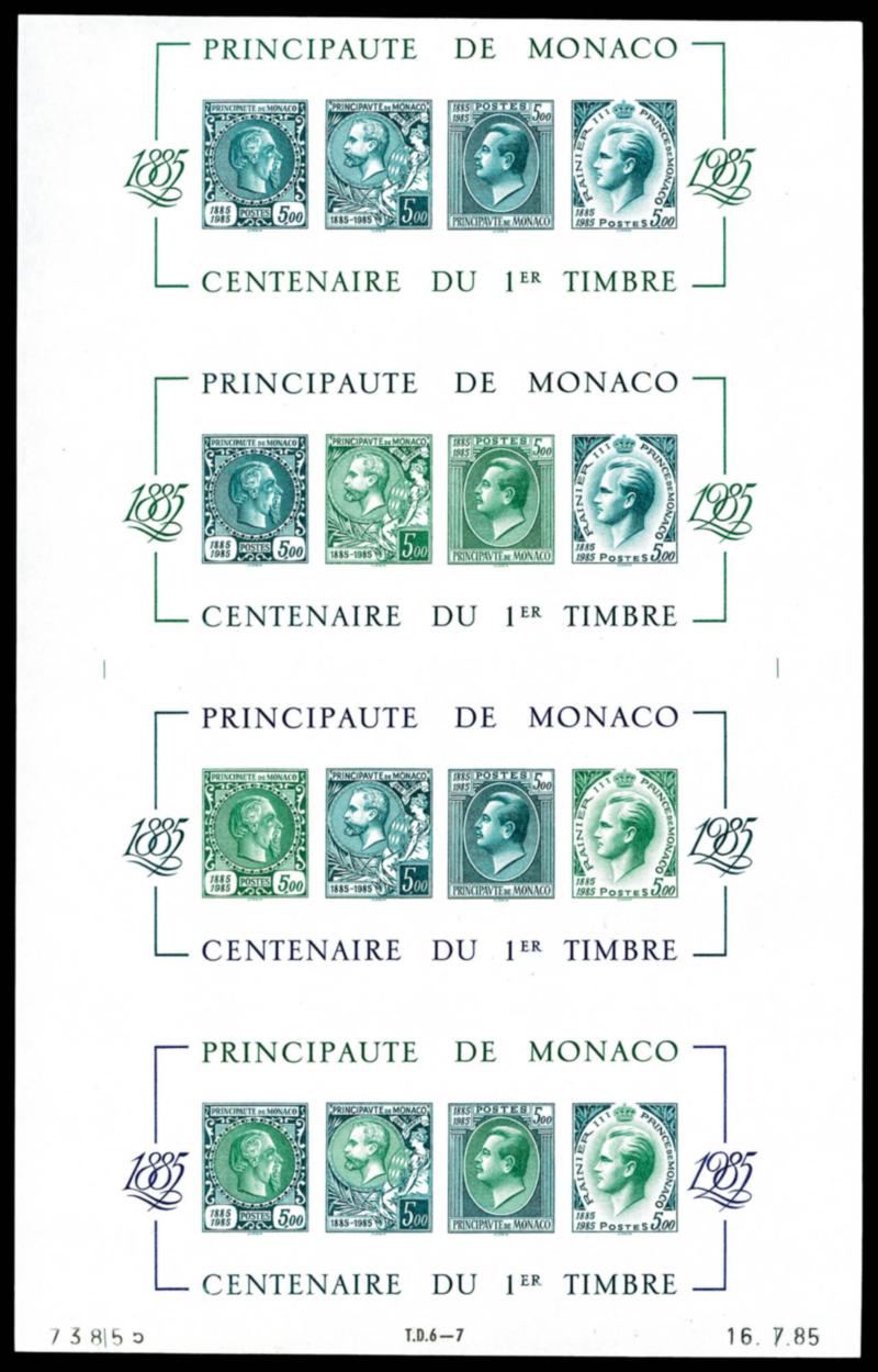 N°33b, Centenaire du 1er Timbre: feuille complète de 4 blocs non dentelés en vert (dont 1 ex vert et bleu) daté du 16.7.85, tirage 100 exemplaires. SUP. R. (certificat) Qualité: ** Cote: 7200 euros (Image)