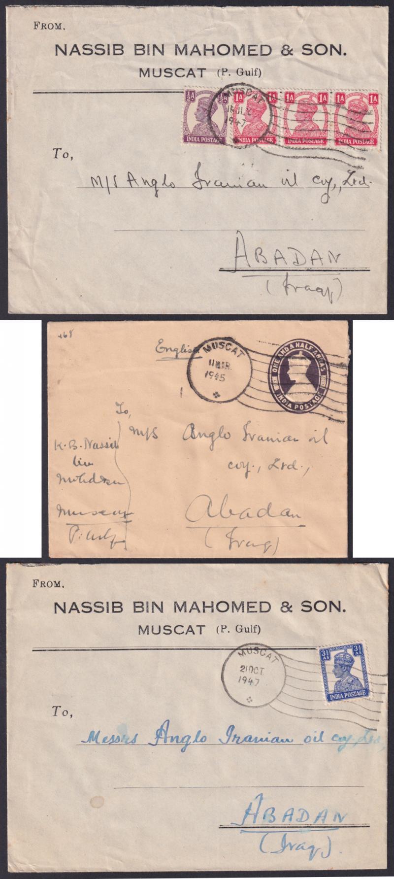 POSTAL HISTORY: 1945-47 group with KGVI values to 3½a plus 1½a Envelope uprated on the reverse tied by 'MUSCAT' "flag" cancels, all to Anglo-Iranian Oil at "Abadan/Iraq" (error for Iran), two with '.../SOR/BASRAH' transit backstamp, three are advertising covers for Muscat merchants Nassib bin Mahomed & Son, minor defects. This and the next two lots have never before been on the market. They are the last covers from the same source as Lots 2797-2811 in our auction of 10-12.11.2022.