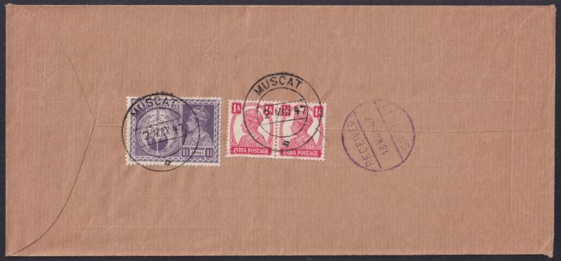 POSTAL HISTORY: 1947 (May 2) commercial cover for Muscat merchants Nassib bin Mahomed & Son to "Anglo Iranian Oil Coy/Abadan/Iraq" (error for Iran) with India 1a pair & Victory 1½a tied to the reverse by superb double-ring 'MUSCAT/ + ' cds, 'RECEIVED/13MAY47/SHIPPING' company arrival marking in violet. Superb. Superior to the very similar cover (one 1a creased) that sold at our auction of 10-12.11.2022 for $1475 (Sale 149 Lot 2809). (Image1)