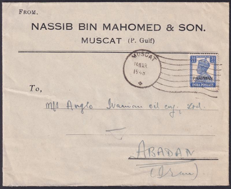 POSTAL HISTORY: 1948 (Mar 14) commercial cover for Muscat merchants Nassib bin Mahomed & Son to "Anglo Iranian Oil Coy/Abadan/Iran" with 'PAKISTAN' Overprint on India 3½a tied by superb 'MUSCAT' "flag" cancel, '.../29MAR48/SOR/BASRAH' (Iraq) transit backstamp. Superior to the only other 'PAKISTAN' franking from the 'find' that sold at our auction of 10-12.11.2022 for $3775 (Sale 149 Lot 2811). (Image1)