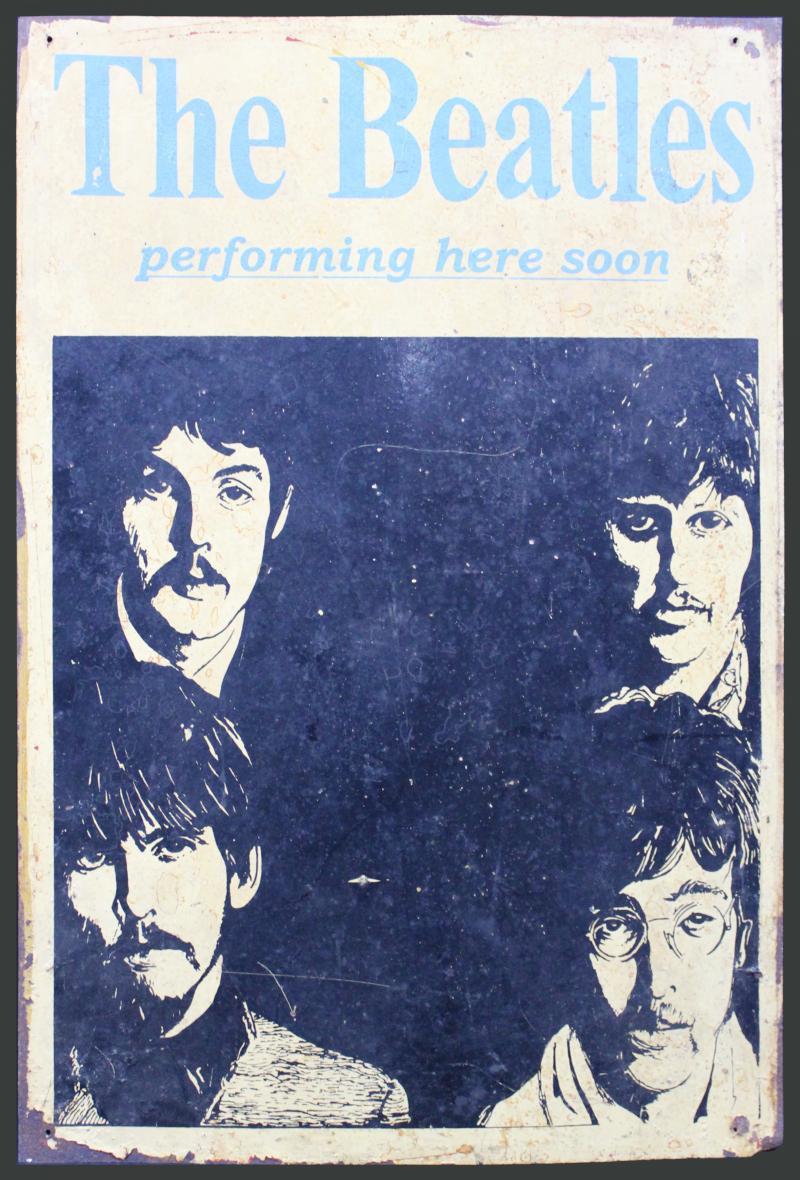 THE BEATLES: Tin sign 'The Beatles/performing here soon' with image of the fab four circa 1967, size 40x60cm, some rusting and paint peeling at edges, holes in each corner - appears to be original from the period. (Image1)