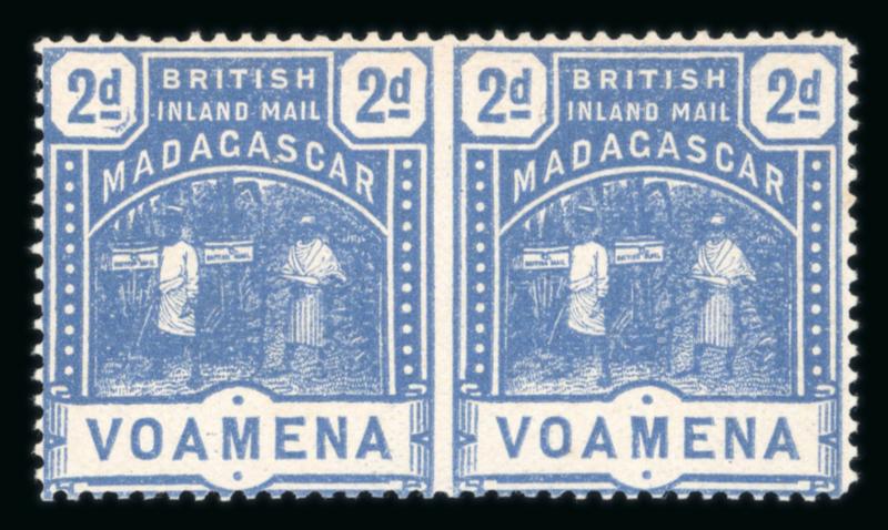 1895 Voamena 2d blue in imperf between horiz pair, mint with large part o.g., a fine example. (S.G. £450). (Image)