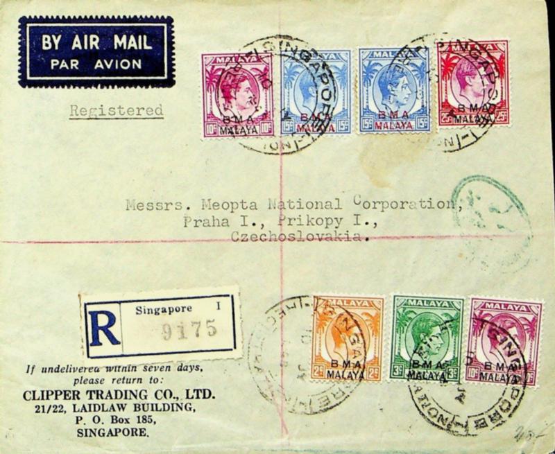 Malaya 1948 7v BMA Malaya ovpt on Singapore regd Airmail cover to Praha Czech CSR (Image)