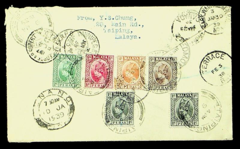 Malaya Perak 1939 WWII, 6v regd cover from Taiping to Terrace Canada (Image)