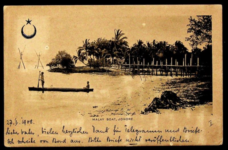 Malaya Johore Bahru 1908 3c on Malay Boat PPC w/ Coat of Arms crested at top via Singapore to Mulhausen Germany (Image)