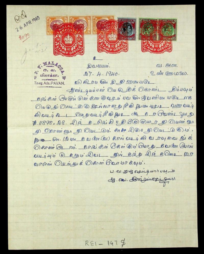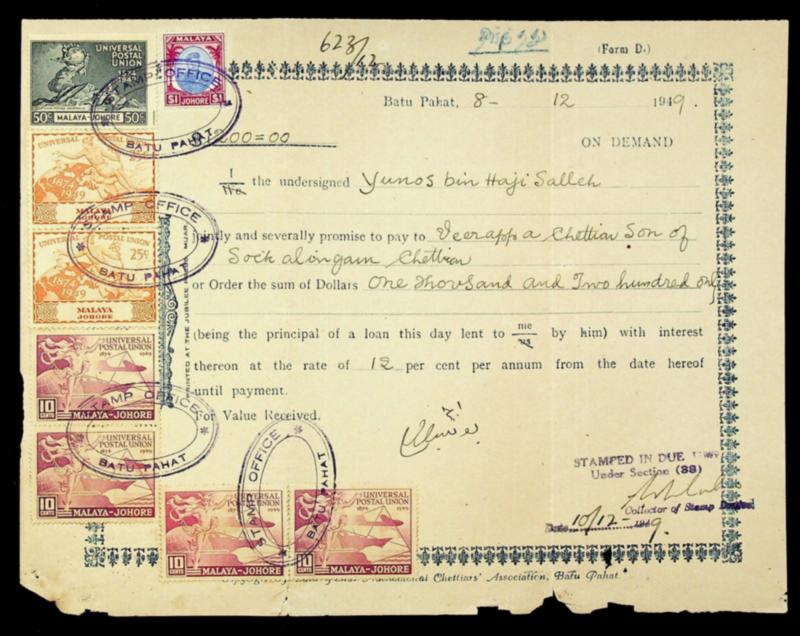 Malaya Johore 1949 UPU 7v+ $1 on signed Revenue Promissory Note w/ "Stamp Office Batu Pahat" cancels (Image)