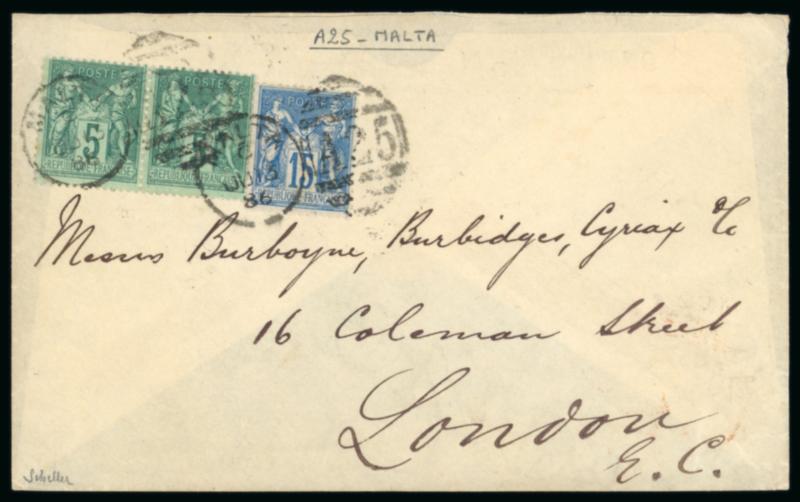 1886 (JU 15) cover to London franked French Peace and commerce 5c. (2) and 15c. tied by two Malta A25 duplex, reverse with Malta cds of same date and hooded red London arrival of JU 21 (Image)