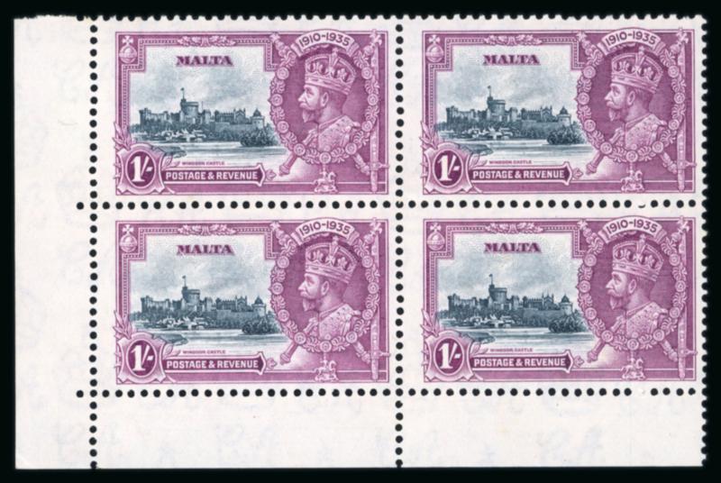 1935 Silver Jubilee 1/- in corner marginal block of 4 mint, fine and lightly mounted, the upper left stamp with 'Extra flagstaff' variety (S.G. £425+). (Image)
