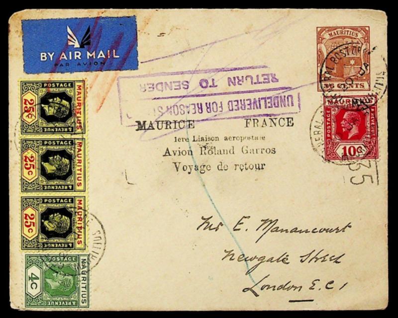 Mauritius 1937 5v uprated airmail envelope w/"return to sender" cachet to London GB (Image)