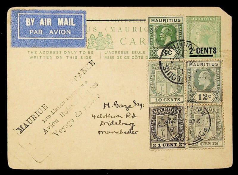 Mauritius 1937 11v uprated on QV 2c s/c airmail FFC to France via Reunion & Madagascar to England (Image)