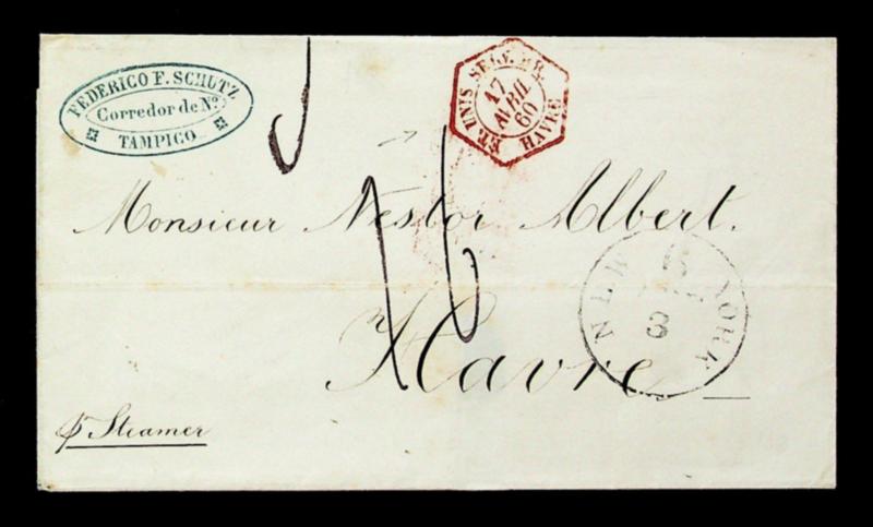 Mexico Tampico 1860 stampless cover per Steamer via New York USA to Havre France w/ Forwarding Agent's seal in red at back (Image)