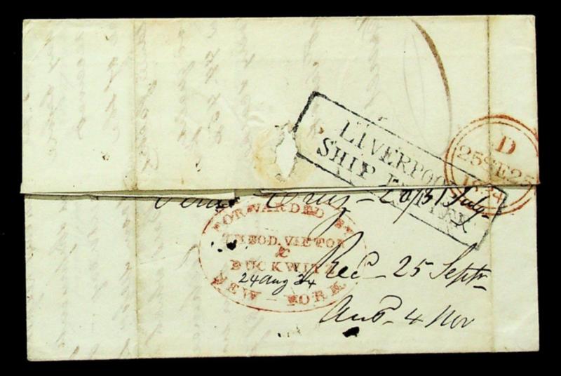 Mexico 1834 prestamp cover from Vera Cruz via New York USA to London England w/ Forwarding Agent's seal in red & boxed "Liverpool/ Ship Letter" cachet (Image)