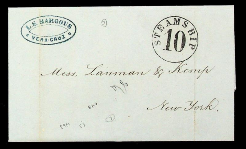 Mexico Vera-Cruz 1862 stampless cover w/ "STEAMSHIP 10" cachet to New York USA w/ "M. ZANGRONIZ, HABANA" Cuba Forwarding Agent's seal on reverse (Image)