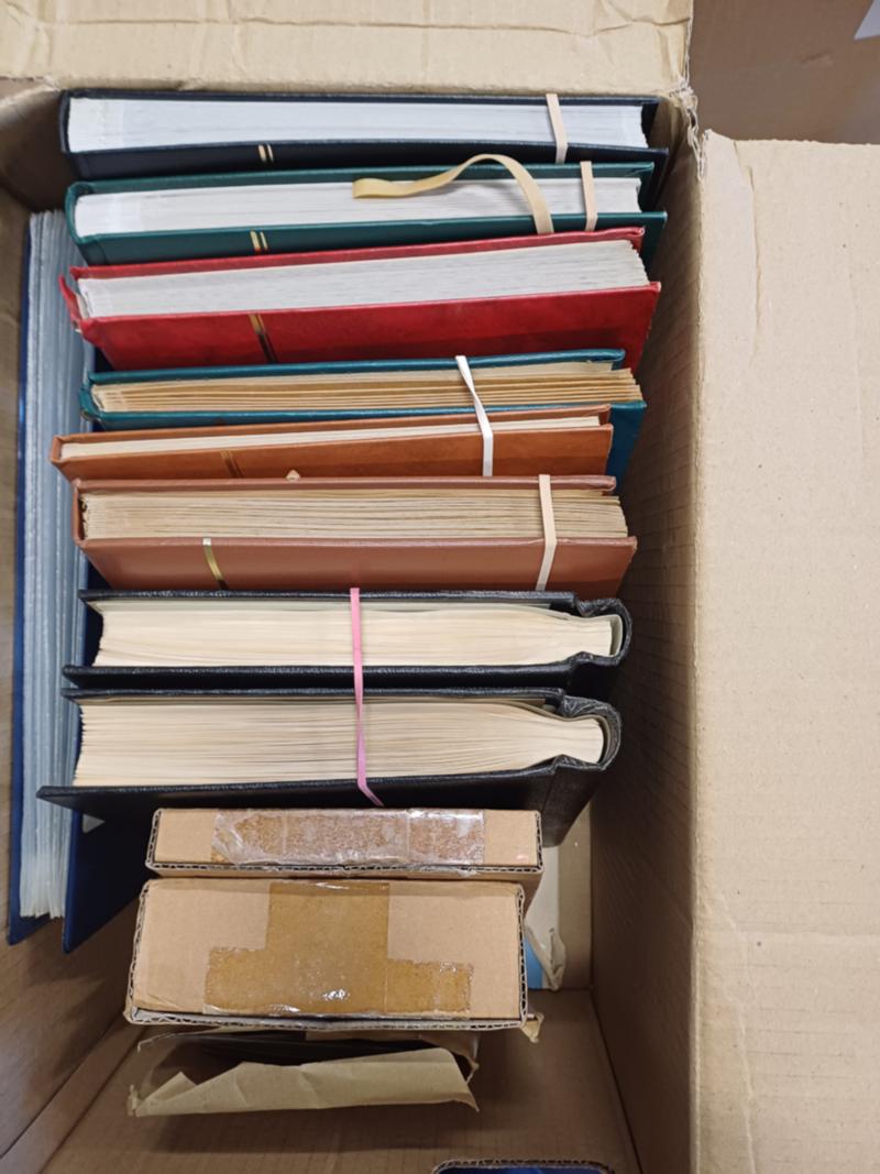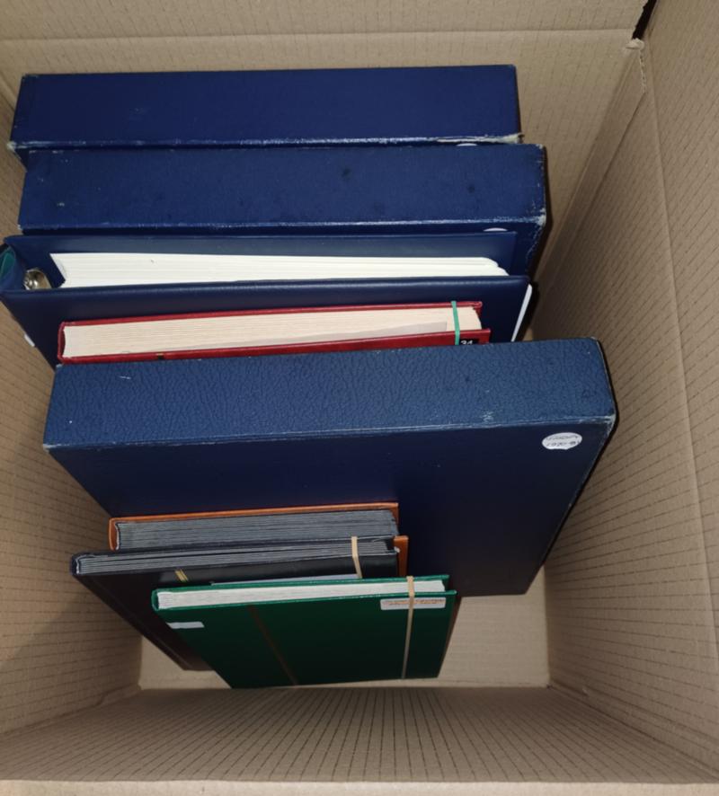 Misc. Lots in Boxes COMMONWEALTH & FOREIGN mint & used mixed box incl. 1992 to 2023 Guernsey & Alderney mint sets & MS with a Face Value of approx. £950 in three stockbooks, GREAT BRITAIN mint & used in two stockbooks incl. some modern Q.E.II mint sets / Presentation Packs with Face Value of £65, a few Q.E.II FDC's (approx. 1965/80's) in a folder , small qty of modern Poland, All World coll. in two loose leaf albums and GERMANY mint & used with a few MS in a stockbook etc. in a medium sized box (Total 8 books, a couple of two ring albums and a folder) (Ref: 00267/1) (Image)