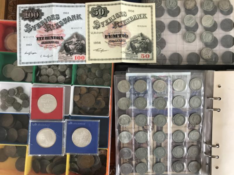 Sweden, Interesting box with e.g. 100's of silver coins old-modern incl. some jubilée, some bank notes incl. few other countries. High silver value. (>1000). (Image1)