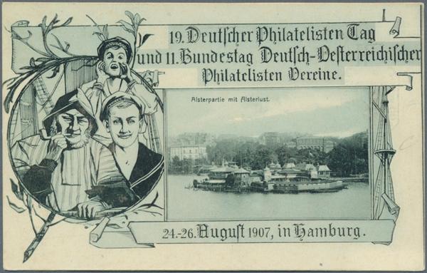 PHILATELISTENTAGE: 1897/1907, HAMBURG - "9. Dt. Philat.-Tag 1897" und "19. Dt. Philat.-Tag 1907" je ungebrauchte Ganzsachen-Ansichtskarte (Image)