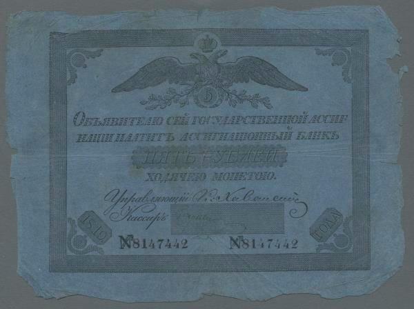1819, 5 Rubles on blue paper naturally worn note in better than average condition. Rare item. ÷ 1819, 5 Rubel auf blauem Papier, Umlaufspuren besser als durchschittliche Erhaltung. Sehr seltene Banknote. (M) (Image)