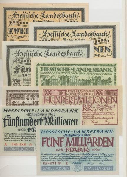 1919-23 (ca.), Sammlung von ca. 350 oft verschiedenen Scheinen im Album und auf Stecktafeln, dabei viel aus der Zeit 1923 und ca. 80 Stck. allein Nordschleswig, ein guter Anteil sehr gute Erhaltung bis Kassenfrisch. Ferner ein Album mit diversen "Randbereichen" wie Banderolen, Gewinn-Anteilsscheine, Bezugsmarken für Lebensmittel usw. (K) (Image)