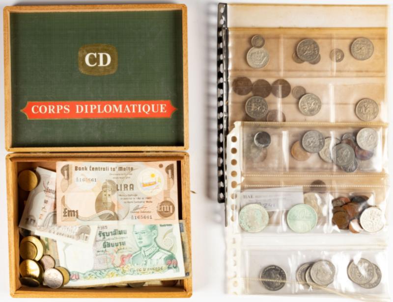 Small box with coins/banknotes Netherlands + world among which Singapore, Germany, Russia, etc. (Image)
