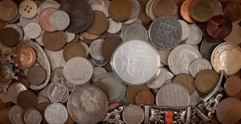 Doosje munten waarbij veel Nederlandse guldens, centen, rijksdaalders waaronder zilver.