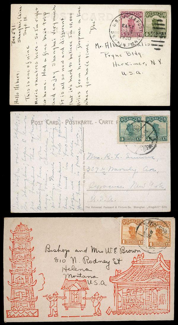 China, 1920's-1930's Cover Group, 13 incl. 1935 Harbin, Manchukuo, 2 postcards incl. 1930 Sea Post, all to U.S., bit musty, generally Fine to Very Fine. Estimate $200-250. (Image)