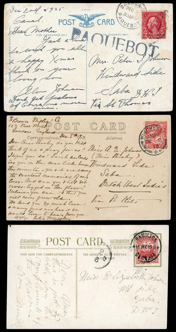 Curaçao, Saba, 30 Incoming Postcards, mostly from U.S., two from Bermuda, one from G.B., all addressed to Johnson family, windward side, about half with Saba incoming cancel, mixed condition as expected, generally Fine. Ex Vadheim collection. Very scarce to find incoming mail in this quantity . Estimate $250-300. (Image)